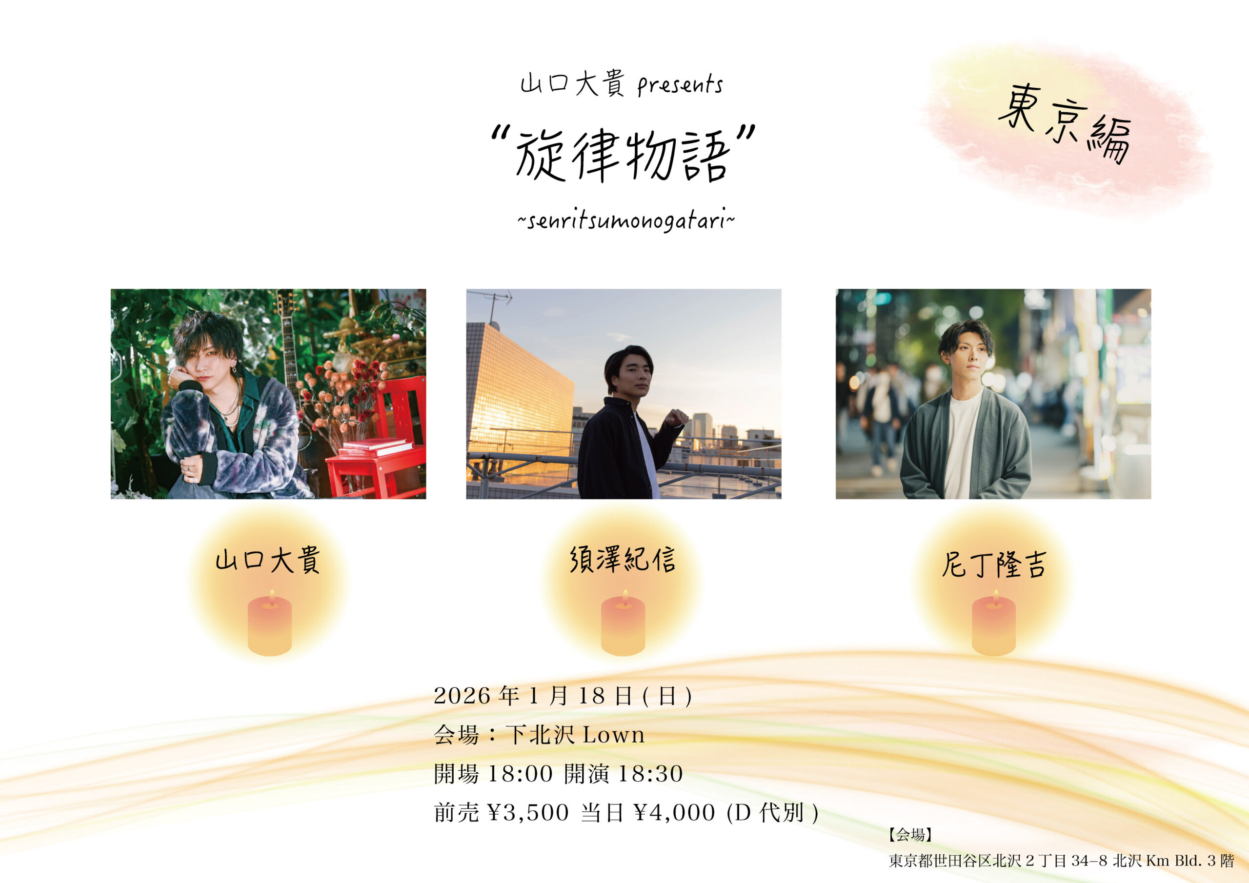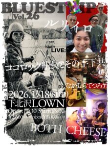 『Bluestrip Vol. 26』 出演:ルリイロ/BOTH CHEESE/ココロック船長とその手下共DJ:なかむらてつろう open 12:30 start 13:00 ーーーーーーーーーーー 1月18日 (日)夜の部 『旋律物語 〜東京編〜』 出演:出演:山口大貴 / 須澤紀信 / 尼丁隆吉 open 18:00 start 18:30 |