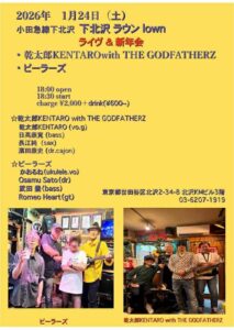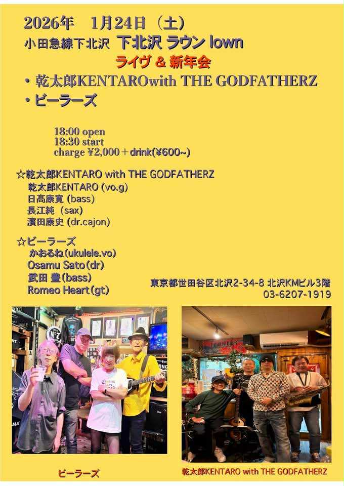 『MIMOGY Presents TOKYO MUSIC TRIP』 出演:MIMOGY & 外山タロウ/高尾彩佳/高橋凉子 open 12:00 start 12:30 ーーーーーーーーーーーー 1月24日 (土)夜の部 『KENTAROU with THE GODFATHERZ open 18:00 start 18:30 |