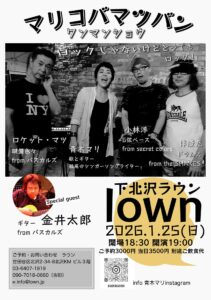 『吉田佳芳子 PRESENTS !』 * 貸し切り 出演:虚構のクレーン(谷口カズヒトVo.ソメEg,アキラB,シャモDr)/ふたり謡象/岡庭伊藤組 open :00 start :00 ーーーーーーーーーーーー 1月25日 (日)夜の部 『マリコバマツバン』 special guest 金井太郎(G) open 18:30 start 19:00 |