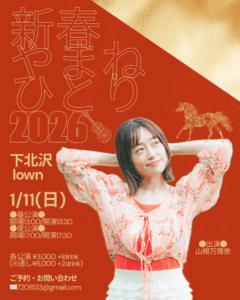 『新春やまねひとり2026』 出演:山根万理奈 open 13:00 start 13:30 ーーーーーーーーーーーー 1月11日 (日)夜の部 『新春やまねひとり2026』 出演:山根万理奈 open17:00 start 17:30 |