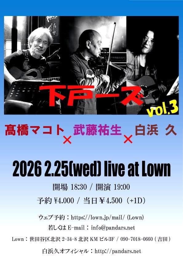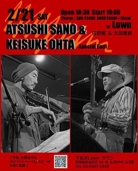 『佐野篤 + 太田惠資 Live at Lown』 出演:佐野篤(Vo.Gt.etc.)太田惠資(Vn) 佐野篤 WS 太田惠資 WS open 18:30 start 19:00 |