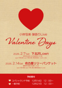 岡本定義 open 12:30 start 13:00 ーーーーーーーーーーーーーー 2月7日 (土)夜の部 小林写楽弾き語りLive 『Valentine Days』 open 18:00 start 18:30 |