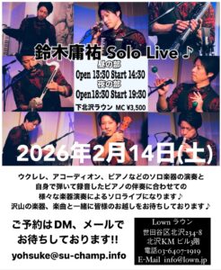 『鈴木庸祐 Solo Live』 open 13:30 start 14:30 ーーーーーーーーーーーー 2月14日 (土)夜の部 『鈴木庸祐 Solo Live』 open 18:30 start 19:30 |