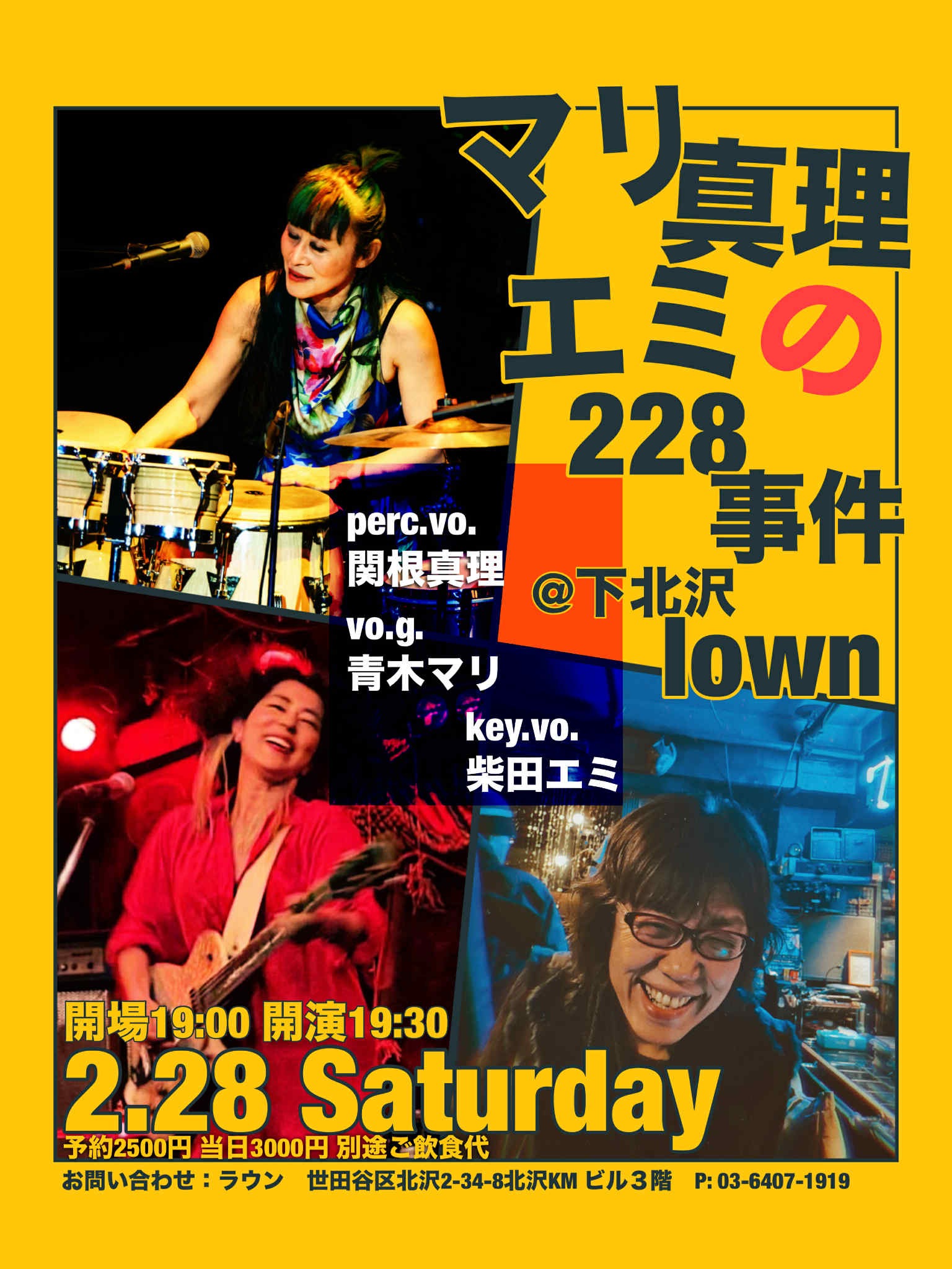 『マリ真理エミの228事件』 出演:青木マリVo.G/柴田えミP/関根真理Vo.Ds open 19:00 start 19:30 |